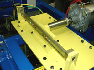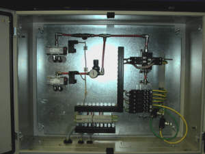 Pneumatic control components of the Speedband are located in one of the two identical pneumatics cabinets. One cabinet is located the moving side and one on the fixed side of the machine. The moving side of the machine is connected electronically to the fixed side via a flexible chain link trunking. This allows for different lengths of board to be accommodated.