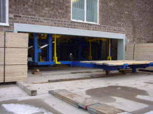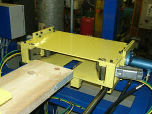 The scaffold boards are passed to this station where the hydraulic rams press the band into the sides of the board. After leaving this station the boards are stacked by the auto stacking part of the Speedband machine…
